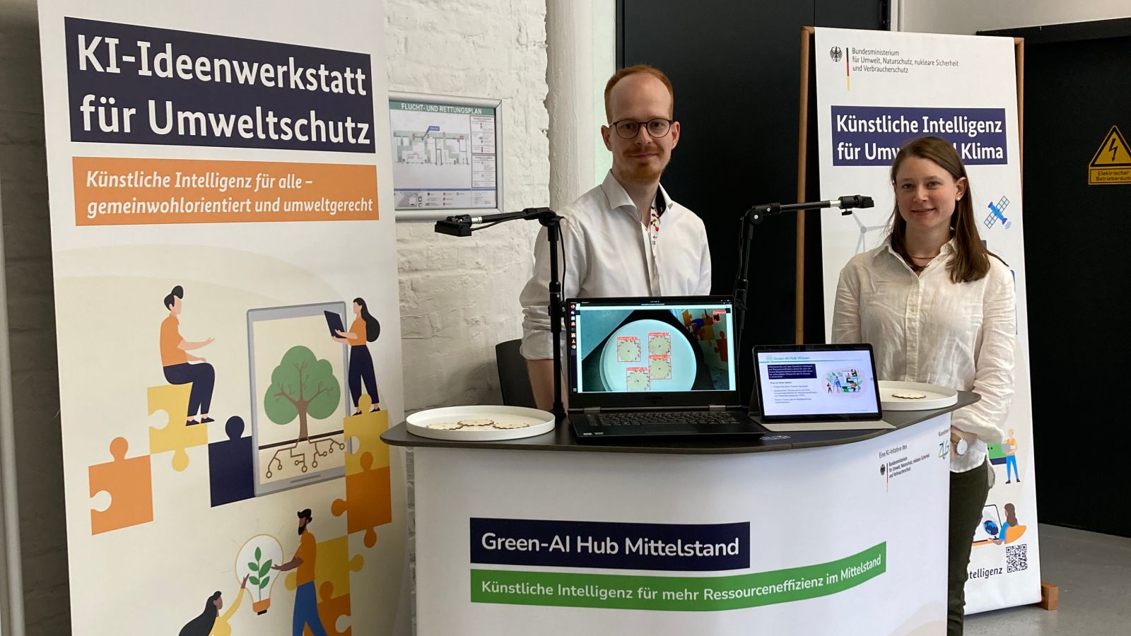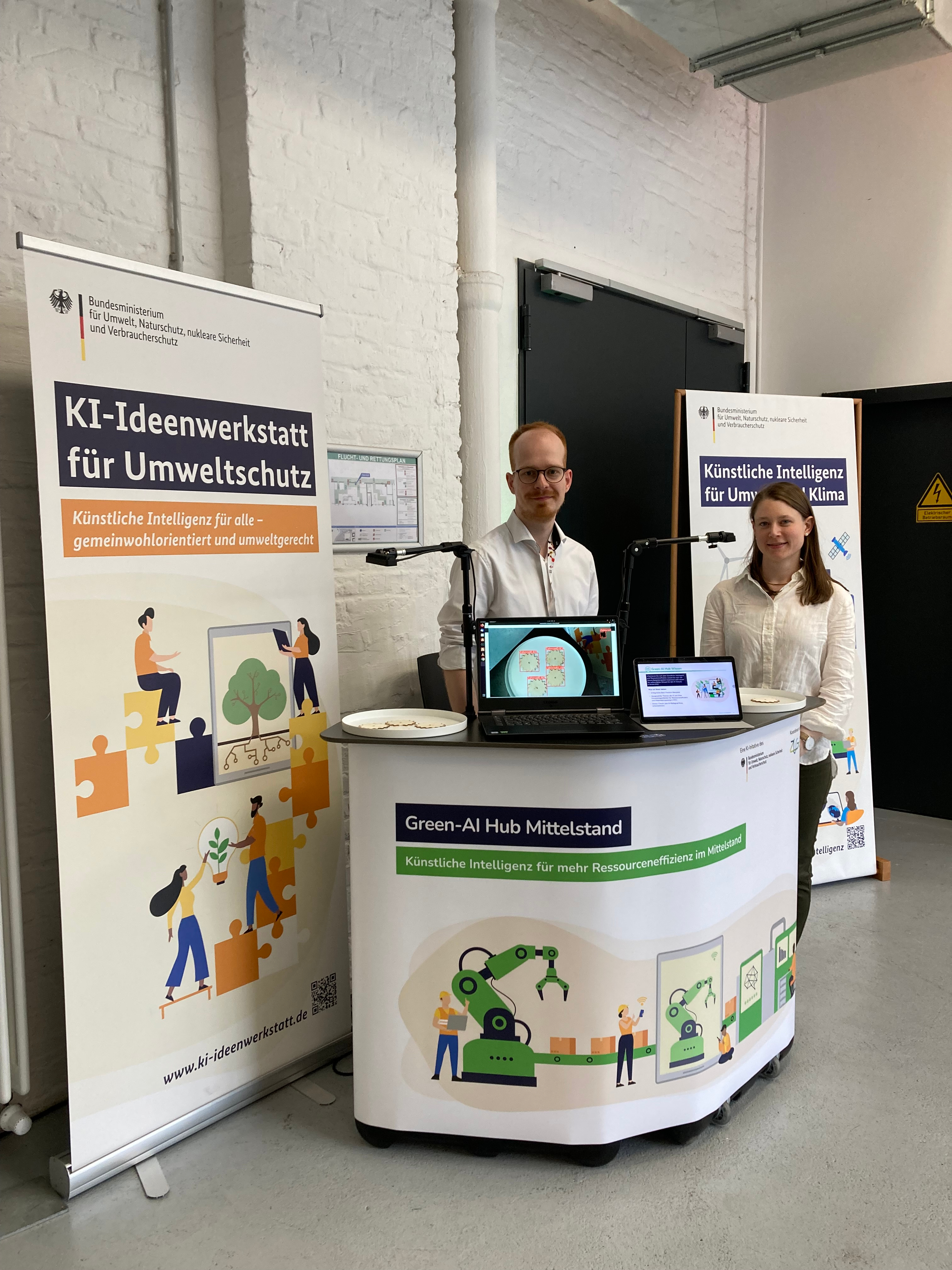 Ein besonderes Highlight der Veranstaltung war der KI-Demonstrator, der vom Deutschen Forschungszentrum für Künstliche Intelligenz (DFKI) betreut wurde. Durch interaktive Präsentationen wurde die oft schwer zugängliche KI-Technologie greifbarer und für die Besucher*innen verständlicher gemacht. Darüber hinaus fanden im BMUV Foyer weitere Hands-on-Workshops statt, bei denen beispielsweise eine Partnerinitiative, die KI-Ideenwerkstatt für Umweltschutz, den Einsatz von KI im Bereich des Insektenschutzes demonstrierte.