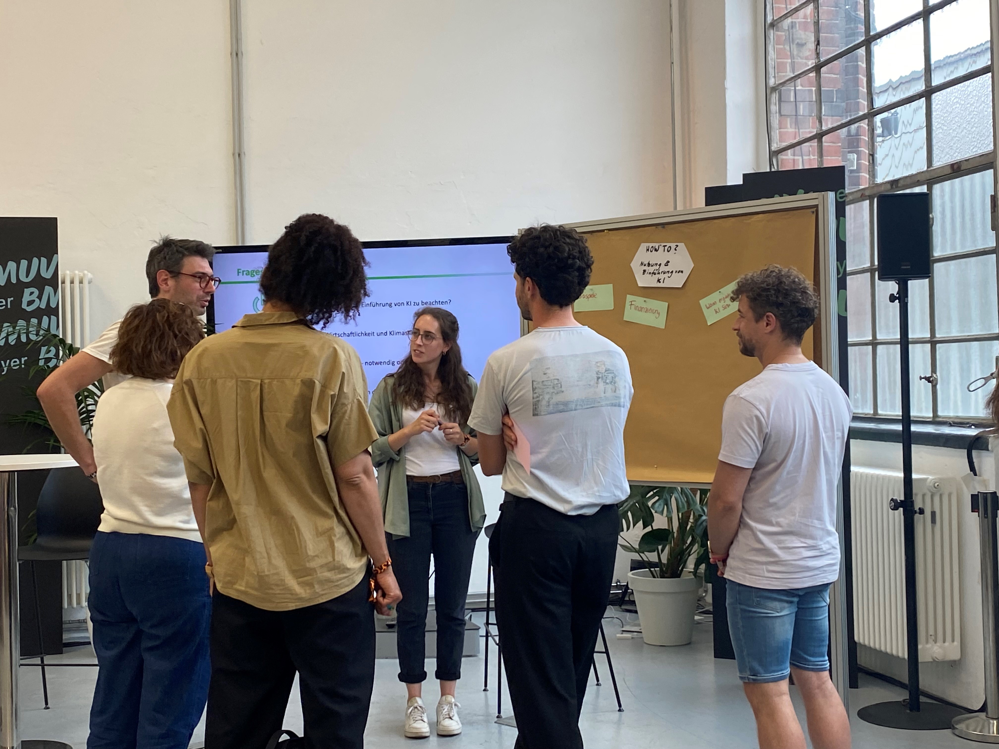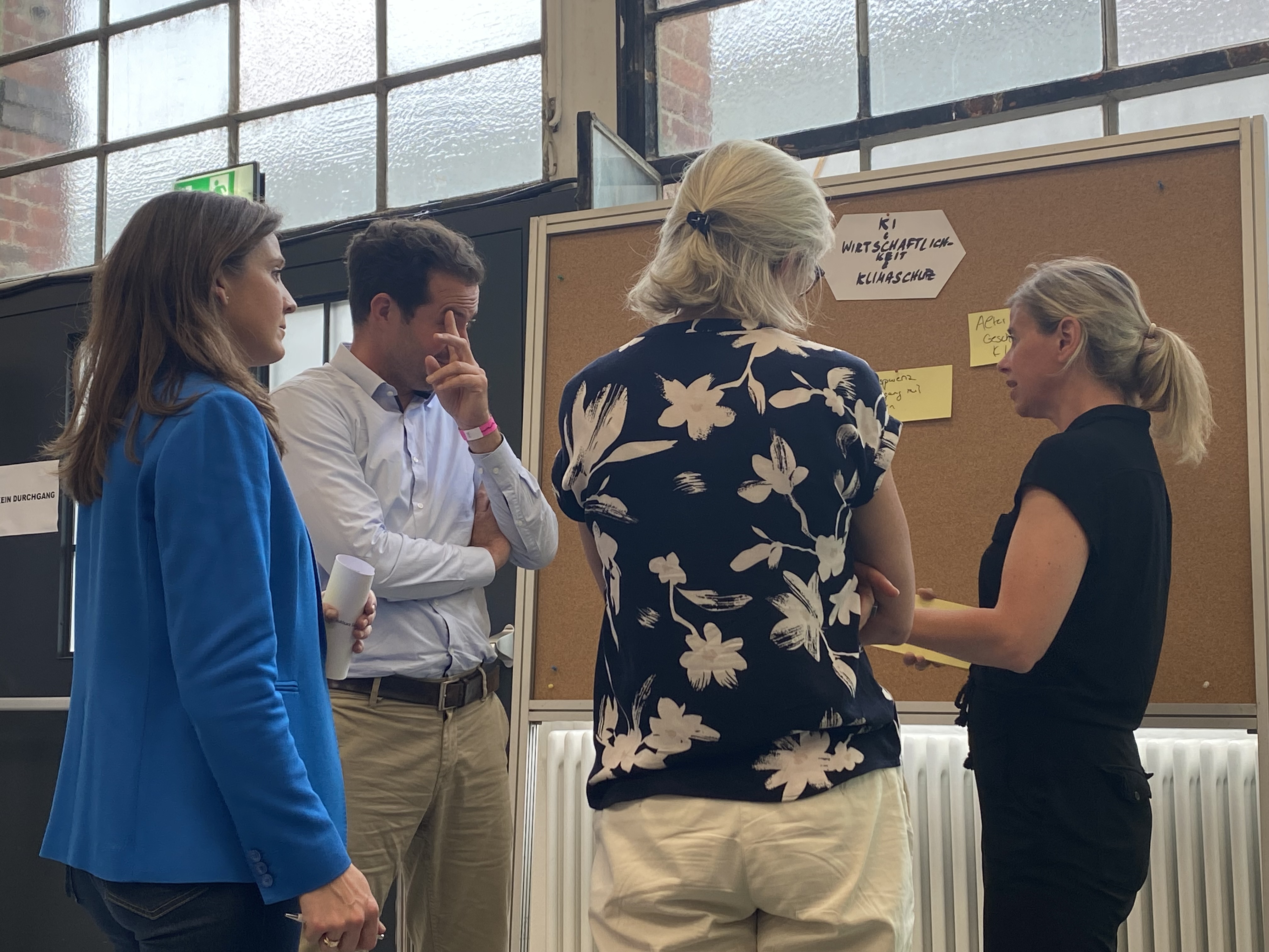 Am 7. Juni um 16.15 Uhr fand im BMUV Foyer die Diskussionsrunde statt, bei der Expert*innen des Green-AI Hub Mittelstand gemeinsam mit dem Publikum über die Chancen der Digitalisierung und Künstlichen Intelligenz zur Ressourcenschonung im unternehmerischen Umfeld sprachen. Die Diskussion drehte sich um die Vereinbarkeit von KI, Wirtschaftlichkeit und Klimaschutz. Im Rahmen des Impuls-Workshops, geleitet von Teresa Petzsche (DFKI), Antje Klemichen (VDI ZRE) und Mareike Bodderas (Z-U-G), hatten die Teilnehmer*innen die Möglichkeit, verschiedene Anwendungsbeispiele von KI zu erarbeiten. Der Fokus lag darauf, wie Unternehmen durch den Einsatz von KI effizienter wirtschaften können, um Kosten zu senken und gleichzeitig einen Beitrag zum Umweltschutz zu leisten. Dieses Win-win-Szenario eröffnet insbesondere kleinen und mittleren Unternehmen (KMU) große Potenziale, um von den Vorteilen von KI-Technologien zu profitieren.