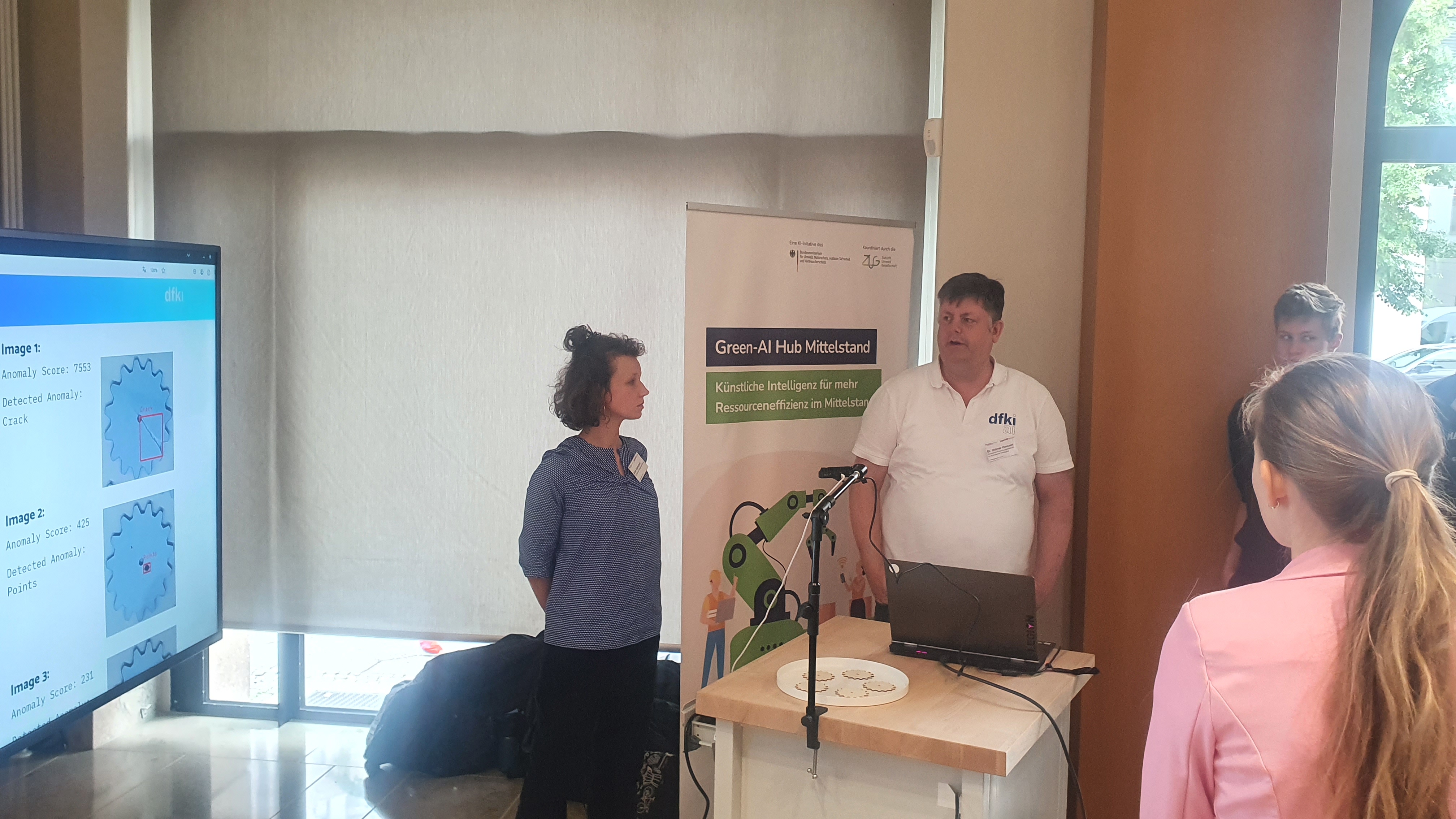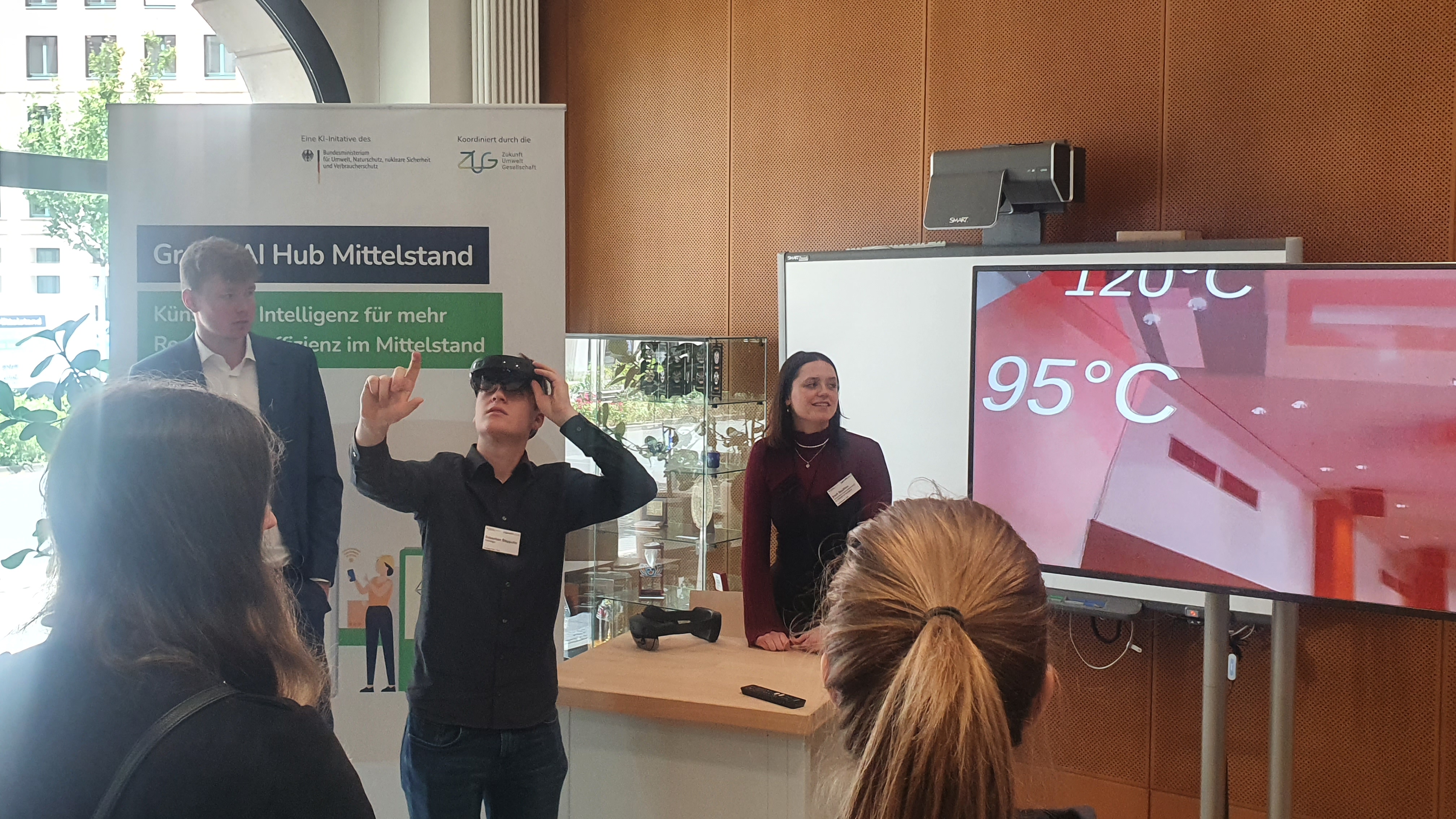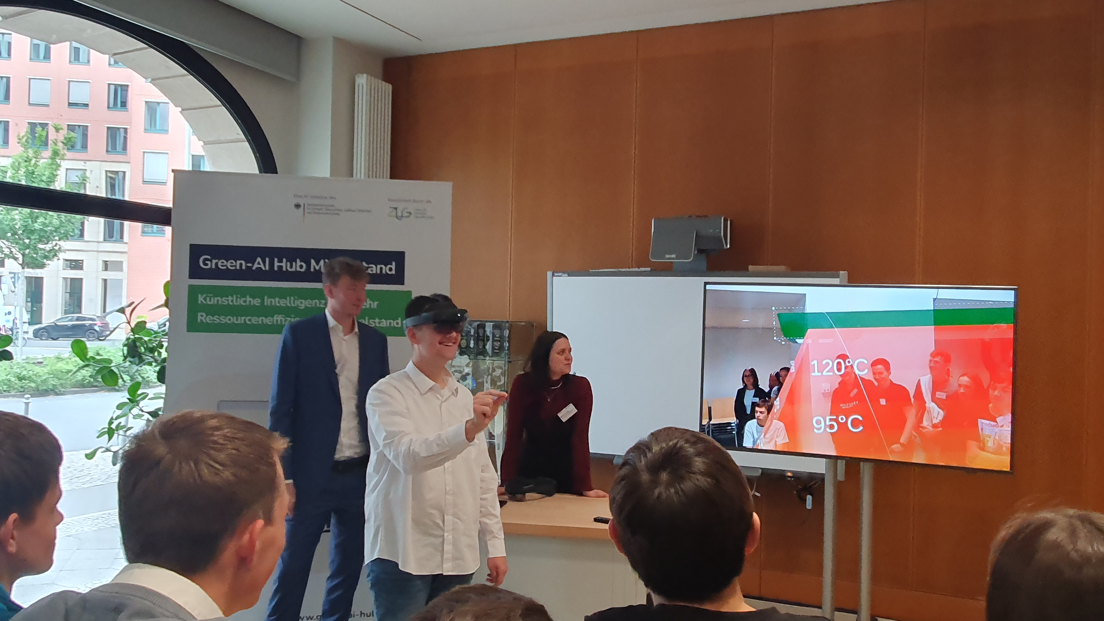 Die rund 50 jungen Preisträger*innen von Jugend forscht hatten die Möglichkeit, modernste KI-Lösungen hautnah zu erleben. Der Green-AI Hub Mittelstand präsentierte ihnen zwei besondere KI-Demonstratoren. Das regte zahlreiche Fragen und Diskussionen an und zeigte die vielseitigen Einsatzmöglichkeiten von KI in der Praxis. Der Augmented Reality Demonstrator vermittelte den Einsatz von KI für die Planung und den Bau von modernen Hallenheizungsanlagen. Er wurde im Rahmen eines KI-Pilotprojekts in Zusammenarbeit mit der Kübler GmbH entwickelt. Der Demonstrator zur Qualitätsbestimmung mittels Computer Vision nutzt maschinelles Sehen, um die Qualität von Produkten zu bewerten. Das zeigt eindrucksvoll, wie KI zur Effizienzsteigerung und Ressourcenschonung beitragen kann.