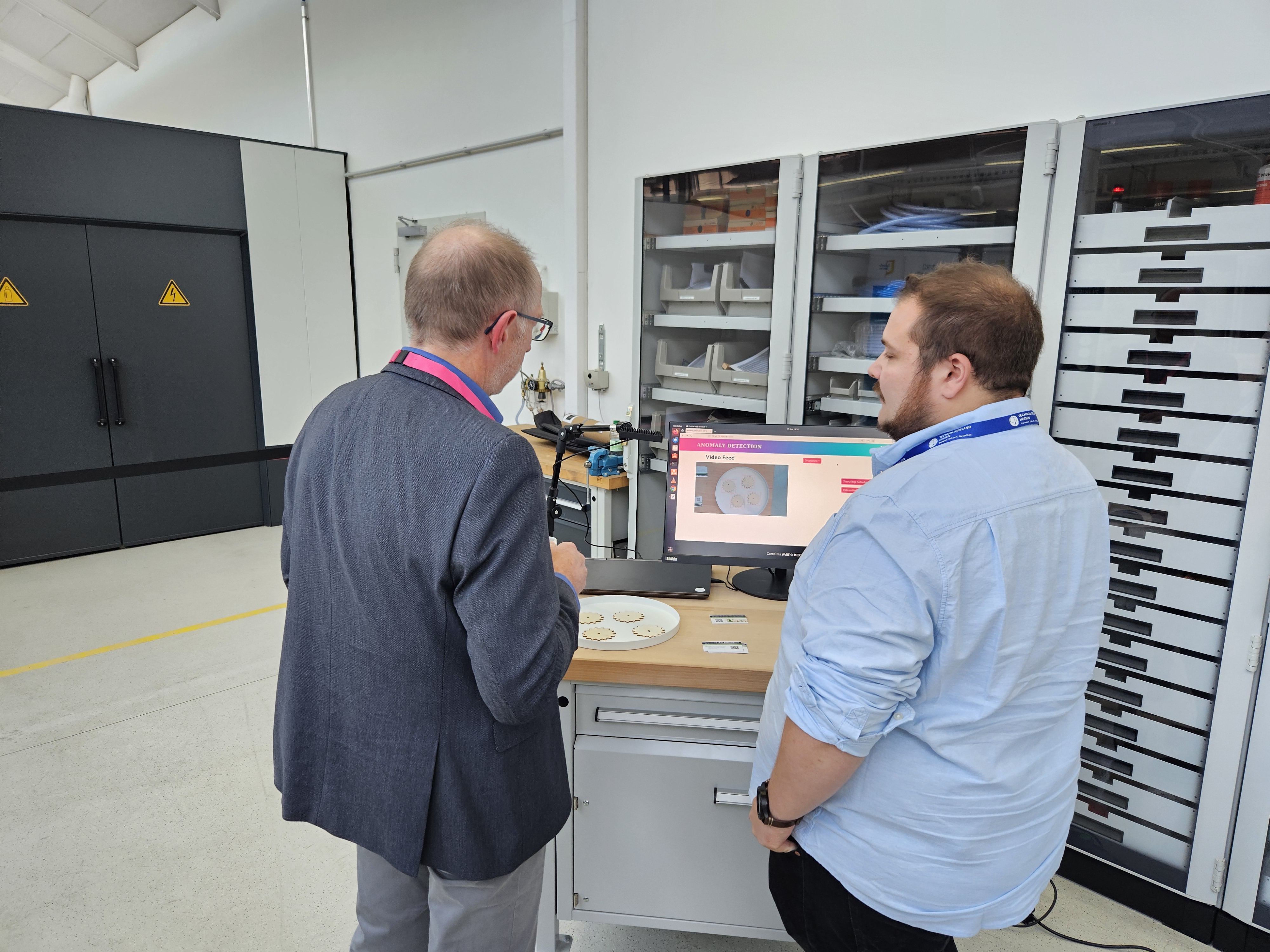 Passend dazu bot der Green-AI Hub Mittelstand den Teilnehmenden die Möglichkeit, KI-Technologien hautnah zu erleben. Mit dem LLM-Demonstrator und dem Lagermanagement-Demonstrator konnten die Besuchenden die praktischen Anwendungen von KI in der Praxis testen und sich von den Möglichkeiten inspirieren lassen. Das KI-Pilotprojekt der 4Packagaing GmbH lieferte zudem spannende Einblicke in innovative Ansätze zur Effizienzsteigerung und Prozessoptimierung. Der Einsatz von KI zur Qualitätskontrolle von Tiefdruckzylindern führte zu einer Reduktion der Fehlerquote im Unternehmen um 20 Prozent. Diese Ergebnisse fanden große Anerkennung bei den Teilnehmenden.